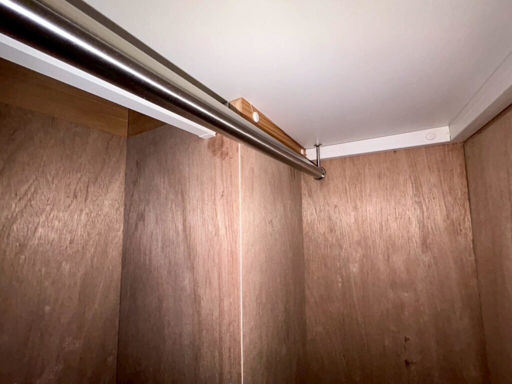 次に、枕棚のブラケットを水平を見ながら取り付け、棚板を設置します。続いて、その下にハンガーパイプ用の金具を固定し、パイプ本体を取り付けました。ぐらつきや傾きがないかを細かく確認しながら、丁寧に仕上げていきます。