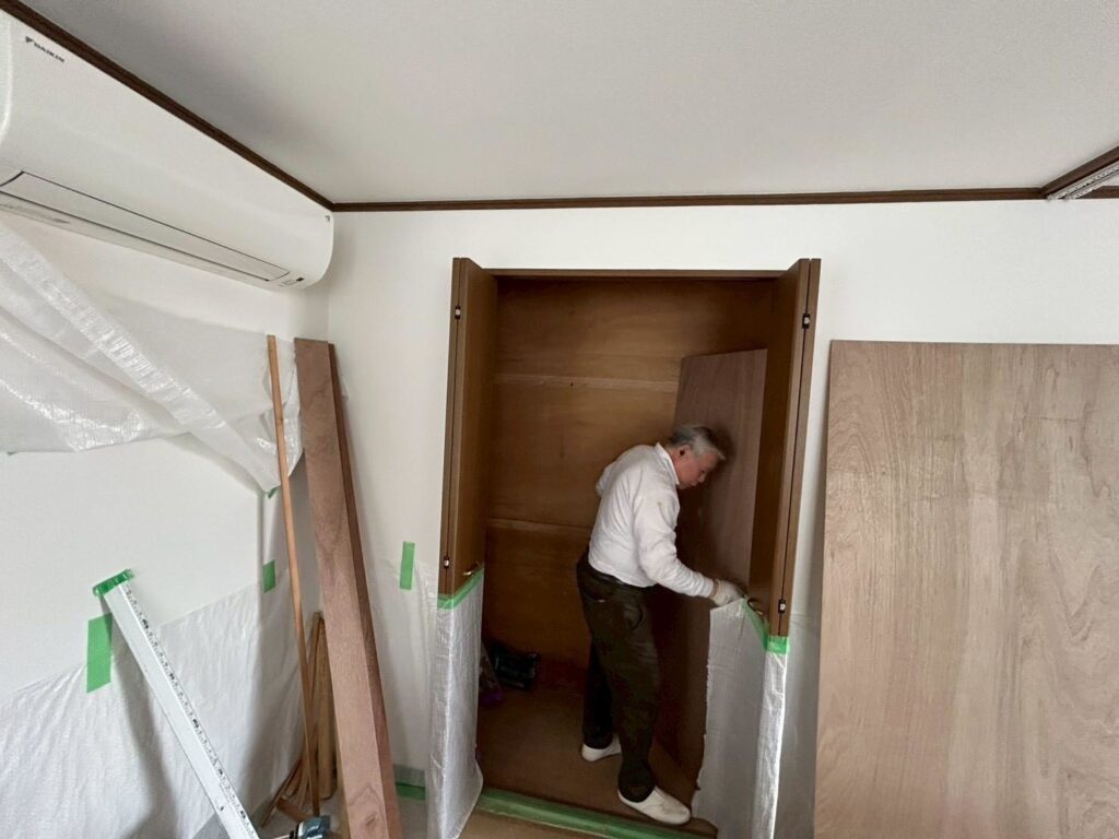 その後、新設する枕棚とハンガーパイプの位置を確認し、下地の有無をチェック。強度が必要な箇所には補強を行い、安心して使用できるように準備を整えました。
