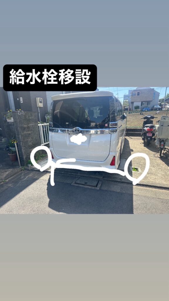 既存の給水栓が駐車スペース内にかかってしまい、車両の出入り時に接触する恐れがある状態でした。このまま使用を続けると、給水栓の破損や漏水につながる可能性があるため、安全性を考慮して移設工事を行うことになりました。