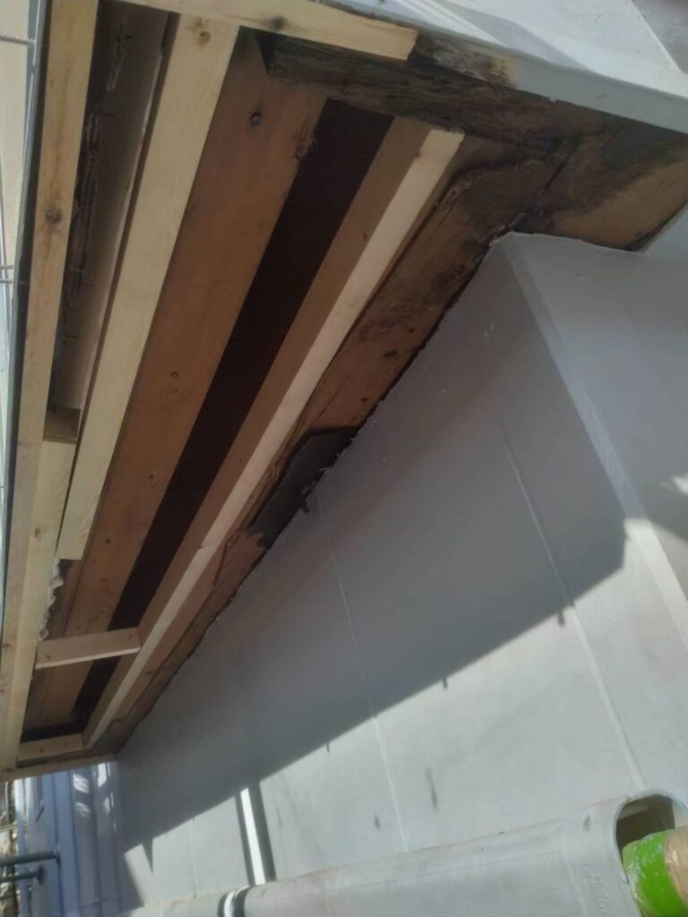 今回の現場では、軒天井材の表面が剥がれ、部分的に黒ずみや浮きが確認できました。お施主様からも「雨の後に軒天が湿っているように見える」とのご相談をいただき、調査を行ったところ、長年の雨水や湿気の影響により、下地材まで劣化が進んでいる状態でした。そのため、部分補修ではなく、出窓下軒天井の張り替え工事をご提案しました。