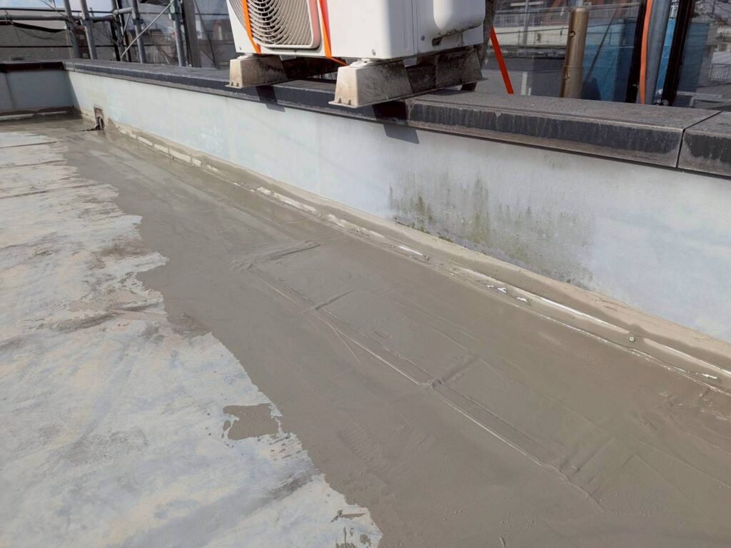特に既存シート防水の上から調整を行う場合は、防水層を傷めないよう施工方法にも注意が必要です。段差の角がなだらかになるよう仕上げることで、新たに施工する防水層やトップコートがしっかり密着し、耐久性の向上につながります。