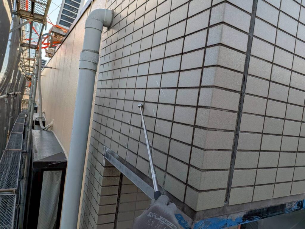 今回の現場では、打診調査を行い、浮きが確認された箇所を特定しました。全面張り替えも検討されましたが、タイル自体の状態が良好だったため、エポキシ樹脂注入による補修工法を採用しました。この工法は、既存タイルを活かしながら補修できるため、コストや工期を抑えられるのが大きなメリットです。