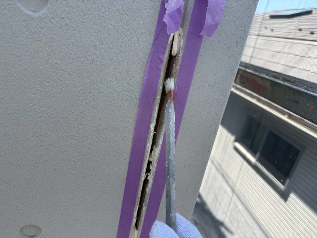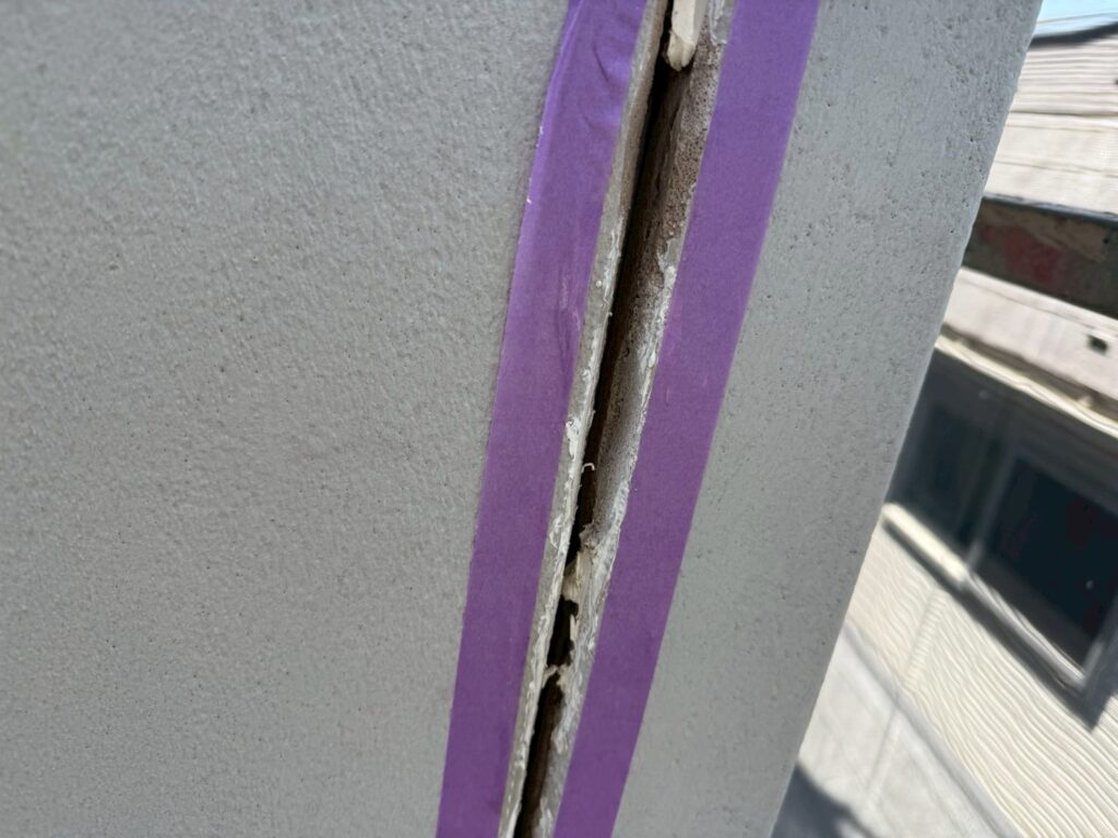 一方で、今回のように幅が広いクラックの場合はシーリング材を充填し、防水性と柔軟性を確保する方法で補修を行います。その後、塗装で仕上げることで外観も回復します。このシーリング材による補修方法は深いクラックには有効で、長期的な防水性を確保するために欠かせない工程になります。