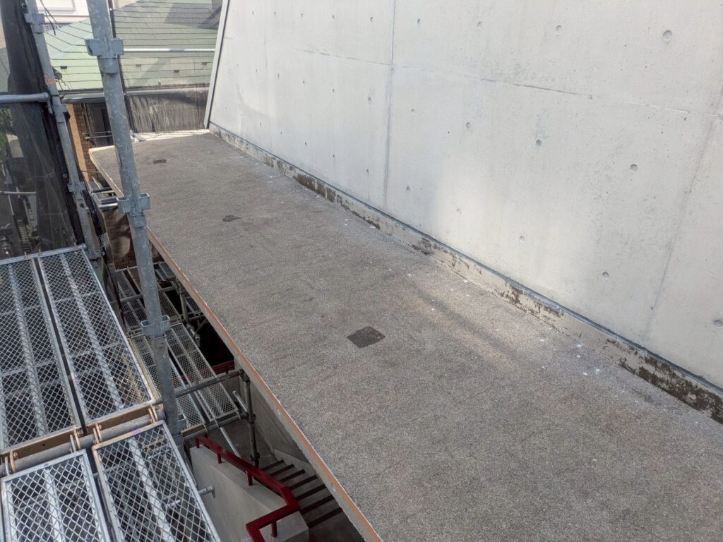 2025.09.24杉並区高円寺北で大庇の天端部分にプライマー塗装を施工しました今回は、杉並区高円寺北で外壁と屋根の塗装を行っている現場でお家に付帯している大きい庇のコンクリート天端(上側の屋根にあたる部分)の防水塗装の施工をしました。