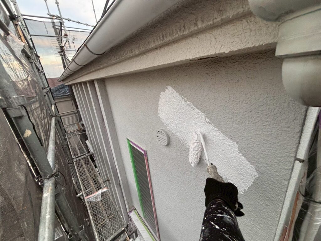 今回は、杉並区宮前で外壁塗装、屋根のカバー工法の作業中の現場で外壁のひび割れを補修したのちに下塗り塗装を実施してきました。