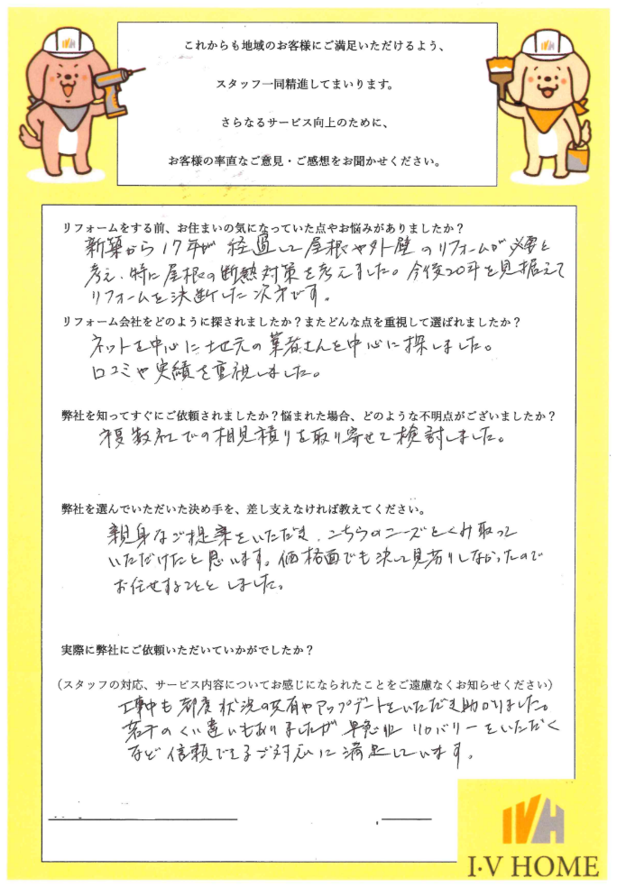 →新築から17年が経過して屋根や外壁のリフォームが必要と考え、得に屋根の断熱対策を考えました。今後20年を見据えてリフォームを決断した次第です。