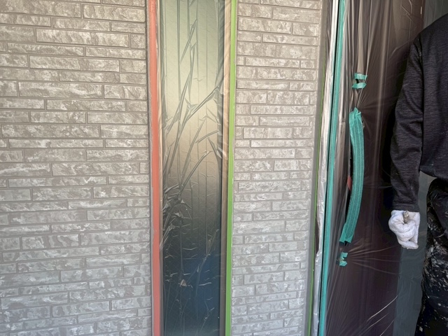 洗浄が終わり次第、壁をしっかり乾燥させ塗装面以外を養生していきます。上写真の緑と紫のテープ部が養生になります。養生をすることで、塗装面と塗装面以外の境界線を綺麗に仕上げることが出来ます。