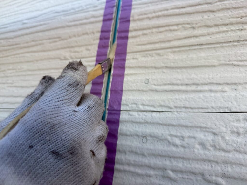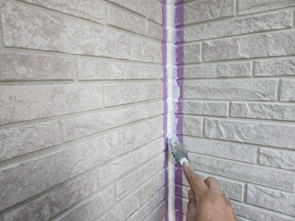 基本的には既存のコーキング材を撤去し、新しく打ち替えを行います。既存材をしっかり除去した後、充填前に目地の側面へプライマーを刷毛で均一に塗布します。プライマーは密着性を高めるための大切な工程です。