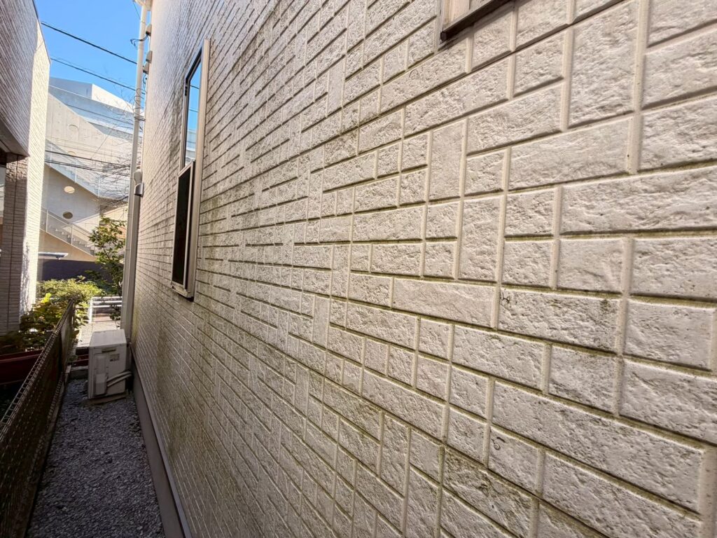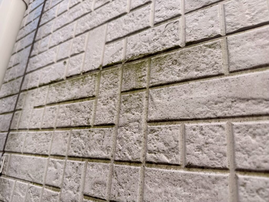 上左の写真から、コケが発生しているのが見受けられます。外壁表面の防水機能が低下すると、雨水や湿気を弾ききれず水分が塗膜や外壁材にとどまりやすくなります。その結果、常に湿った状態が続き、コケの胞子が付着・繁殖しやすい環境が形成されてしまいます。