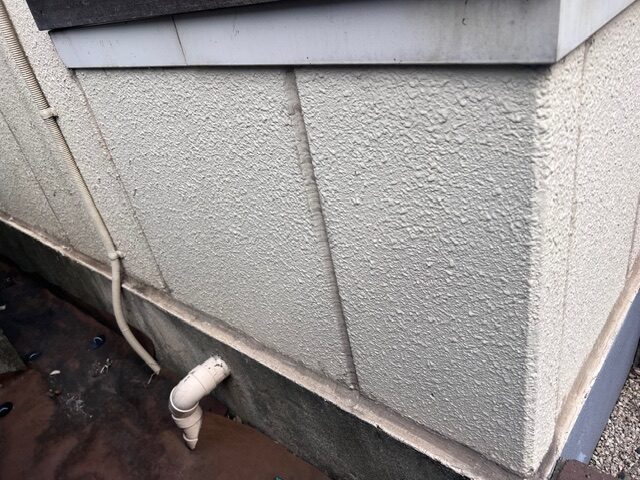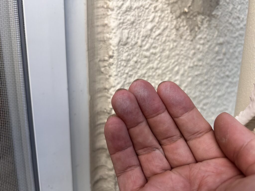 現地調査を開始し、外壁に触れるとチョーキング現象が起こっていました。チョーキングは、紫外線や雨風の影響で塗料の樹脂成分が分解され、顔料が粉状になって表面に出てくる現象になります。外壁を手で触ると白い粉が付くのが特徴です。外壁材を保護する機能が弱くなっており、塗膜の防水性が低下している場合に見られます。