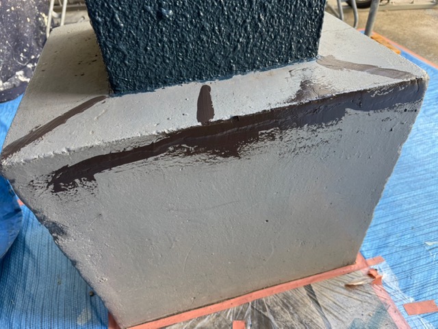 今回はメーカーからの仕様書通り、表面のひび割れをコーキングにより充填し下地処理を行った後、基礎面の保護として基礎ガードを2回塗布しました。